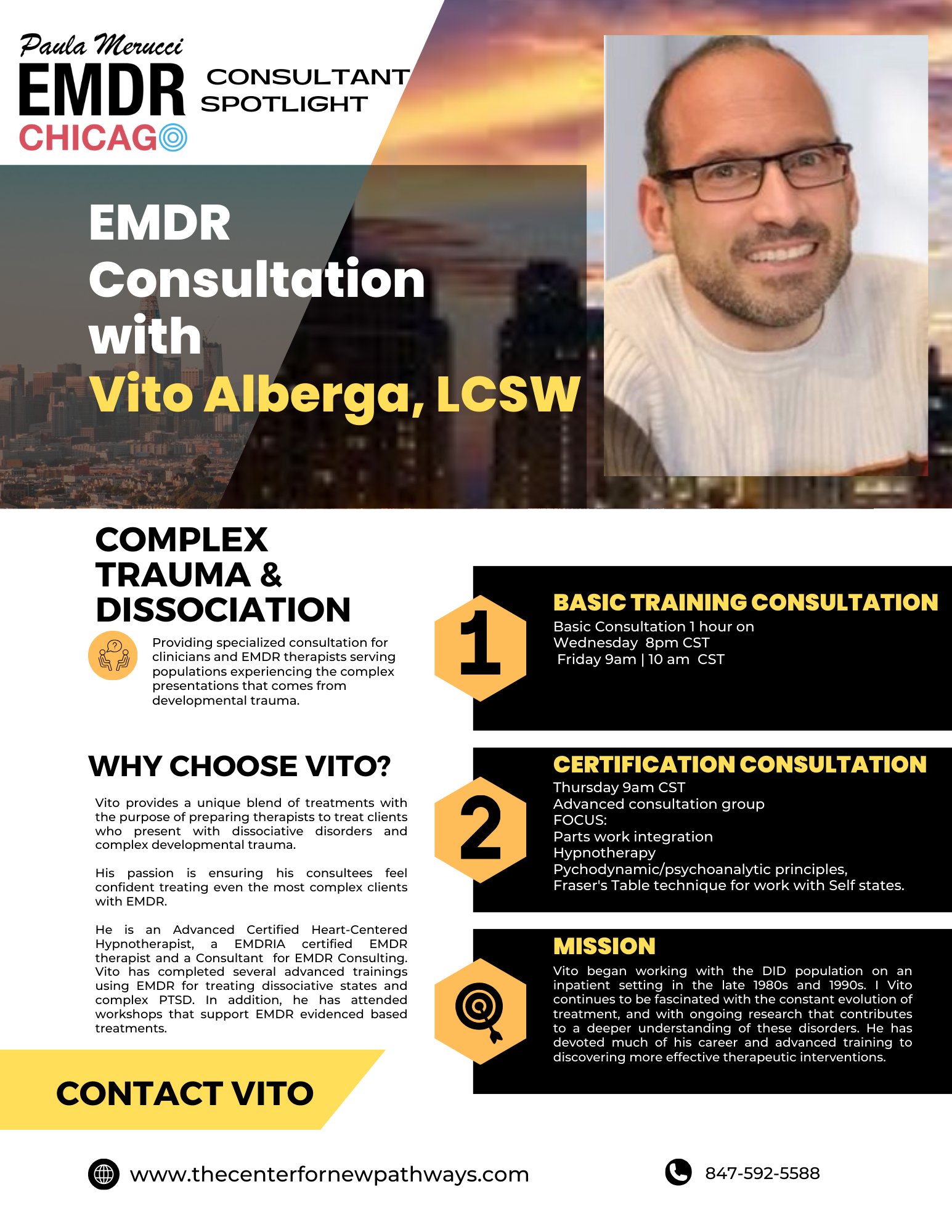 Vito Alberga is a Licensed Clinical Social Worker working in the mental health field for over 28 years. He is an Advanced Certified Heart-Centered Hypnotherapist, a EMDRIA certified EMDR therapist and a Consultant in Training for EMDR Consulting. Vito has completed several advanced trainings using EMDR for treating dissociative states and complex PTSD. In addition, he has attended workshops that support EMDR evidenced based treatments. Vito has recently joined the EMDR Consulting Team in Chicago under the direction of Paula Merucci, LCSW and looks forward to supporting the team as Lead Technical Support for their virtual trainings. He has also taught as an Adjunct Professor at National-Louis University where he taught workshops on treating trauma and shock. Vito is the Founder and Director for The Center For New Pathways Integrative Wellness Center, a leading wellness center that offers acupuncture, chiropractic, energy work, massage services, as well as trauma informed psychotherapy. The Center is located in Schaumburg, Illinois. Vito has a full time private practice where he specializes in trauma informed therapies while working with adults, children, and adolescents. For more information about Vito, please visit thecenterfornewpathways.com